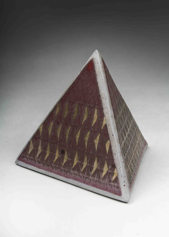Object in de vorm van een pyramide met roodbruine en paarsbruine vlakken met patroon van kleine goudkleurige driehoekjes