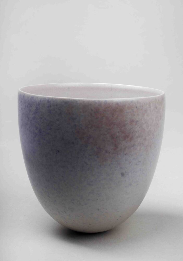 Hoge komvorm met dunne, licht grijze wand, voorzien van een zweem blauw glazuur en een oranje rood glazuur aan de binnenzijde en ronde bodem.