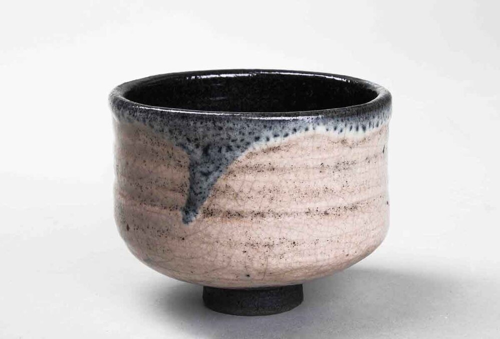 Rechte komvorm op voet, overdekt met een zachtroze craquelé aan buitenkant en een zilvergrijs luster glazuur aan de binnezijde