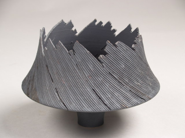 Mat zwarte schaal op voet, uitlopend in een wijd uit lopende wand, die vernauwd en rafelig uitwaaiert in de ruimte. De bovenste helft van de wand is ingekerfd met een patroon van diagonale richels die op diverse hoogten eindigen.