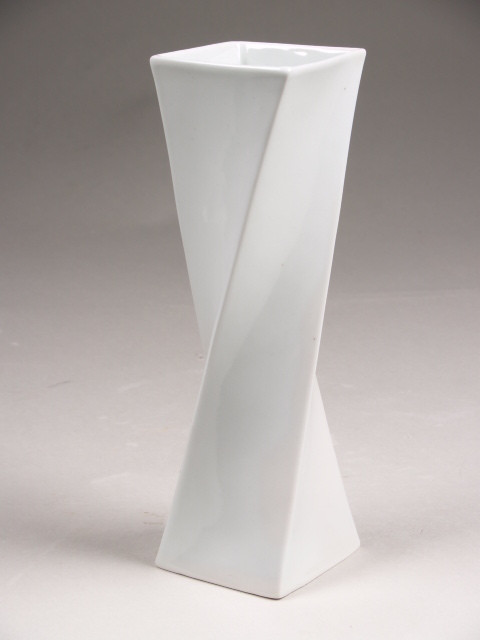 Witte glanzende vaas, waarbij in het ontwerp de vierkante basis naar de bovenkant toe een kwart slag gedraaid is. Er is zo een getordeerde wand ontstaan.