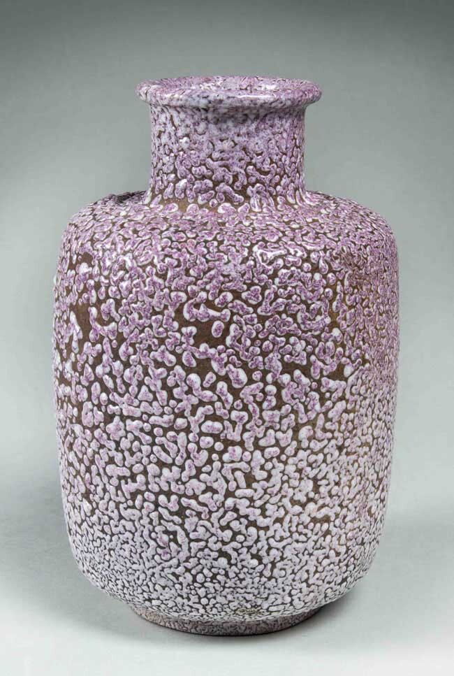 Vaas met rechte, hoge buik en rechte hals overdekt met een wegtrekkend (schiftend) wit-lila glazuur waardoor het bruine steengoed zichtbaar is.