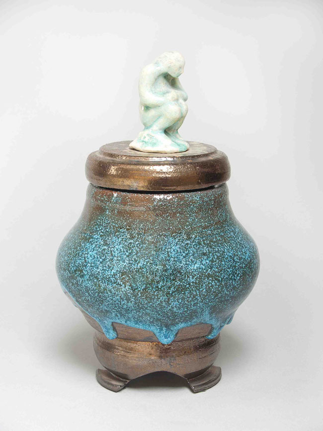 Dekselpot op drie poten, bekroond met mensfiguurtje en voorzien van turquoise druipglazuur over bronskleurig glazuur.