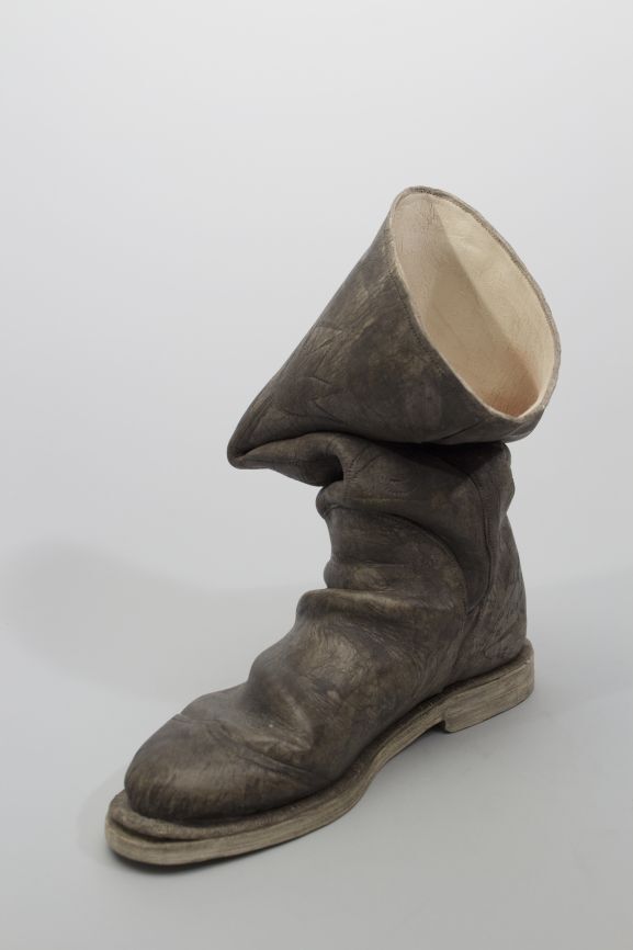 Beeld in de vorm van een afgezakte bruine mannenlaars, zogenoemd trompe-l'oeil, voorzien van functionele en decoratieve stiksels.