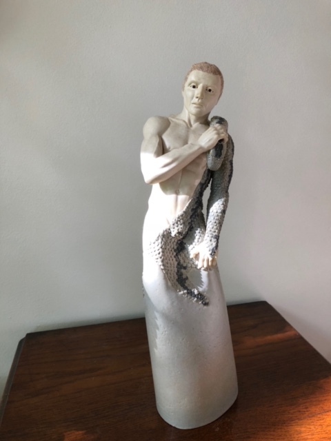 Beeld van staande naakte mannenfiguur op sokkel, zijn arm en zijn lichaam gedeeltelijk bedekt door slangenhuid, met recherhand slangenkop vasthoudend.