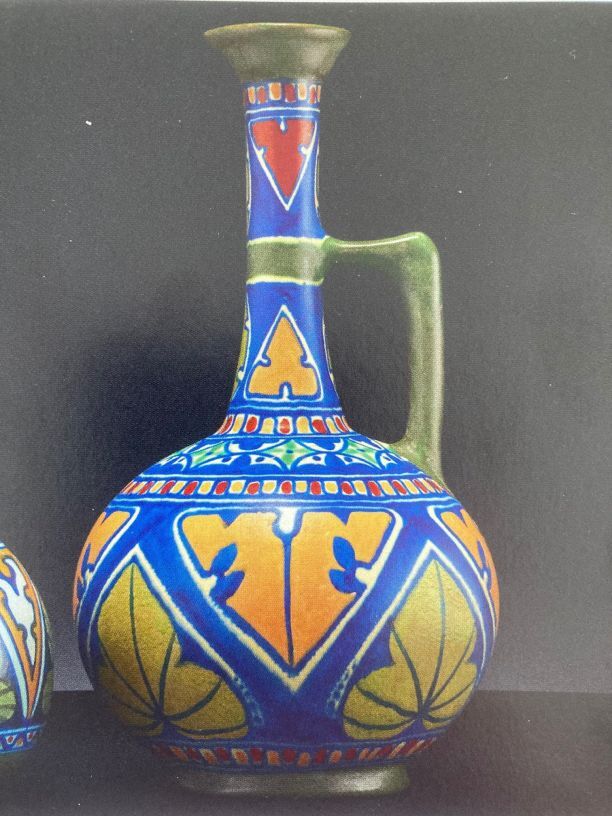 Een kan met bolle buik, hoge hals en rechthoekig oor, gedocoreerd met het florale decor Matapan in de kleuren blauw, groen, oranje/geel en rood.