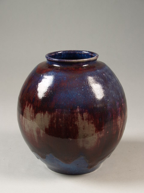 Bolle vaas overdekt met loopglazuur in blauw, beige en oxblood rood