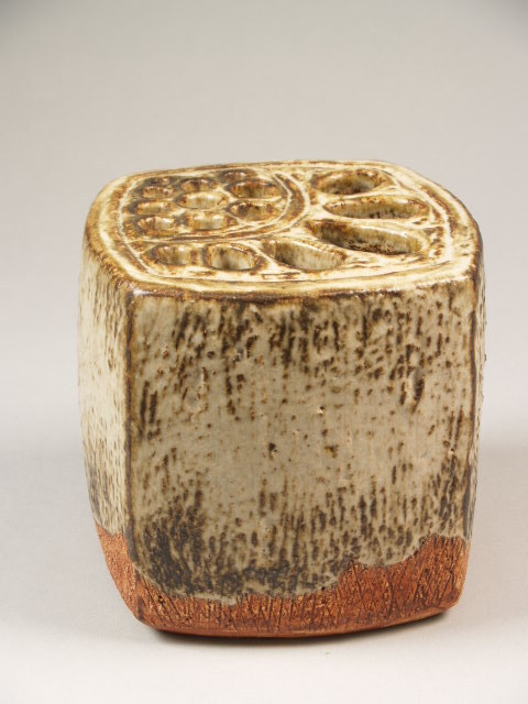 Rechte pot met iets gebogen zijden. De bovenkant is afgedekt door een uitgesneden bovenplaats die de vorm van een stralende zon suggereerd. Grijs/bruin loopglazuur