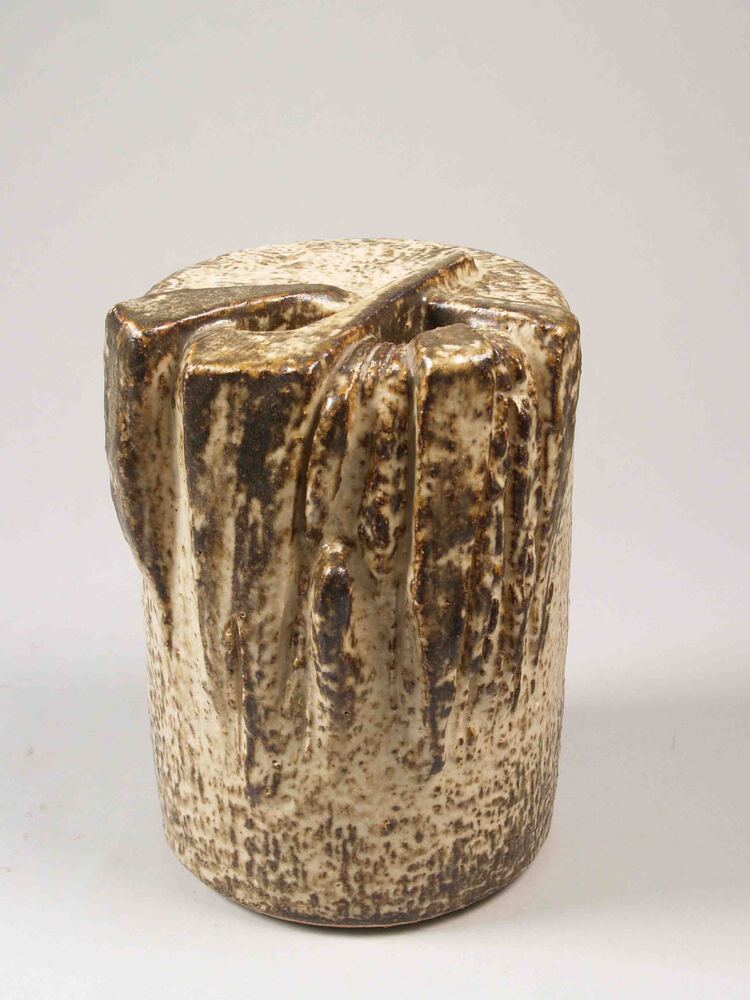 Cilindrische vaas met 2 gaten in het bovenvlak. Vanuit deze gaten lopen over boven-en zijkant een aantal kleirepen. Groen-bruin geglazuurd.