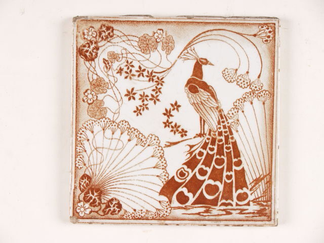 Tegel met een bruin decor van een pauw omringd door plantmotieven