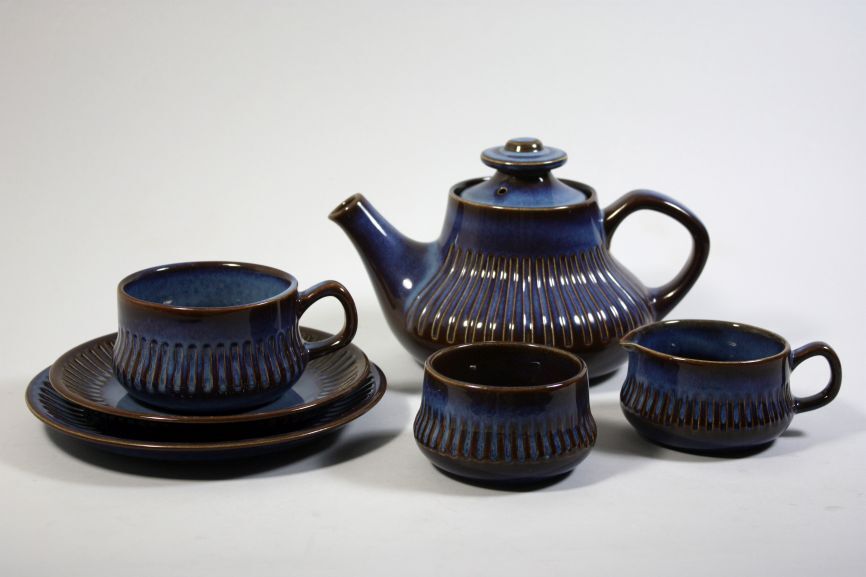 Servies overdekt met een bruin en blauw loopglazuur. Reliëfdecor van verticale lijnen aan buitenzijde