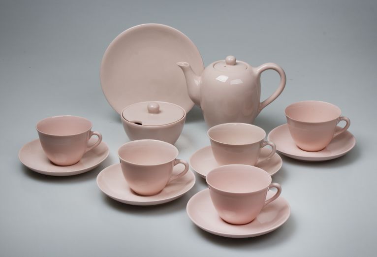 15-delig servies van gekleurd porselein, overdekt met transparant glazuur.