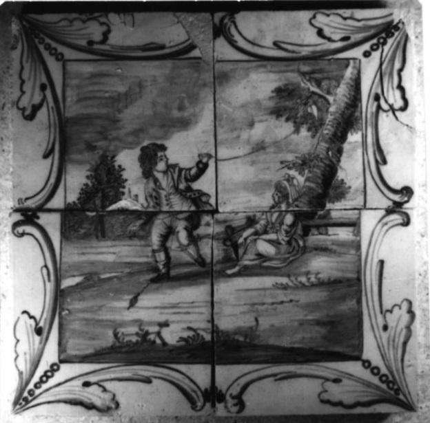 Gele scherf, lichtblauw op wit fond, in een vierkant een voorstelling van een vliegerende jongen, zittend meisje, boom en landschap, om dit vierkant ranken met acanthusbladen op een witte band van 3,5 cm.
