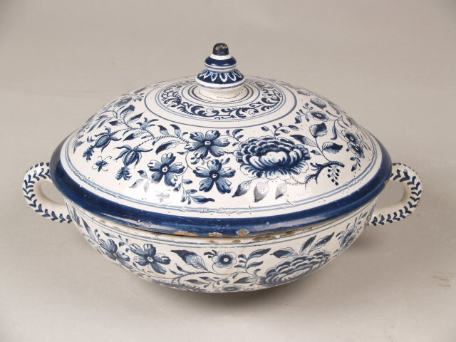 Terrine bestaande uit dekschaal met deksel en twee oren. De terrine heeft een decoratie van bloemmotieven in twee tinten blauw.