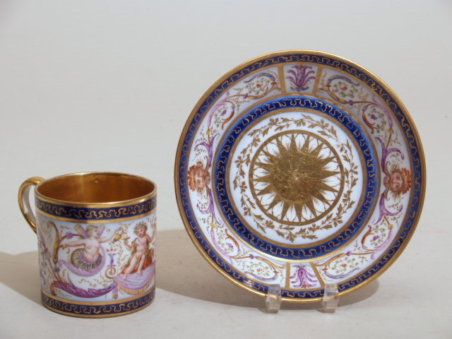 Kop en schotel van porselein, polychroom gedecoreerd en versierd met goud. De kop is centraal versierd met een brede band met daarin een druk gedecoreerde voorstelling van putti in een wolkenlandschap met veel ornamentele decoraties. De band is ingekaderd tussen biezen van goud met daartussen een band in een donkerblauwe grondkleur, die is versierd met ...