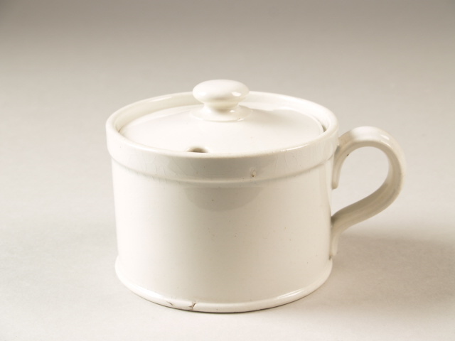 Rechte bodem, verdiept in een naar buiten verdikte voetring; cylindrische wand met naar buiten verdikte rand en rechte sluitring intern. ?-vormig oor, licht gewelfd deksel met plat-ronde knop en vrijwel rechte , afgeronde sluitring. In de rand van het deksel opening voor het metalen lepeltje. Materiaal: geelgrijs aardewerk met transparant crème glazuur. Lepeltje metaal was ...
