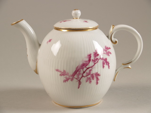 Een theepot van porselein, waarvan de buik een geribbelde structuur heeft. De buik is gedecoreerd in bietenrood met een voorstelling van een vogel op een tak en wat strooibloemen, het deksel en de knop zijn eveneens gedecoreerd met strooibloemen. De randen, delen van het oor en de aanzet van de tuit zijn gedcoreerd met gouden ...
