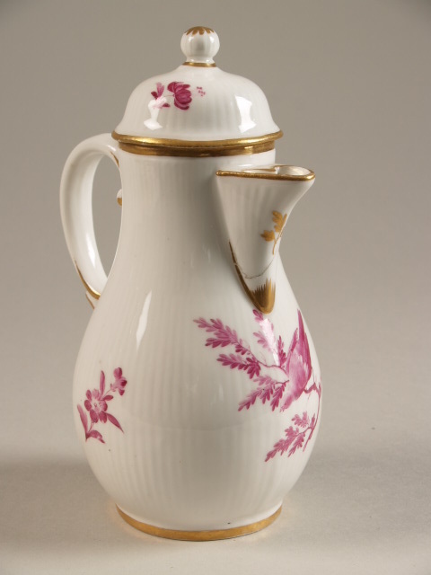 Een melkkan van porselein, met een geribbelde structuur. De buik is gedecoreerd in bietenrood met een voorstelling van een vogel op een tak en wat strooibloemen, het deksel is eveneens gedecoreerd met strooibloemen. De randen, delen van het oor, de knop en de tuit zijn gedecoreerd met goud.