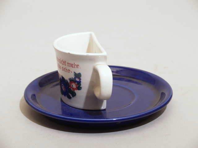kop heeft omtrek van halve cirkel; holle bodem, c-cormig oor van iets onder de rand tot even onder midden van de wand. Beschildering onder het glansglazuur in rood, groen en blauw. (bloemen en blaadjes + de tekst Ëin halbes Tässchen doch nicht mehr. Du sollst es haben, bitter sehr") Schoteltje: rechte bodem waarbij middeenstuk iets ...