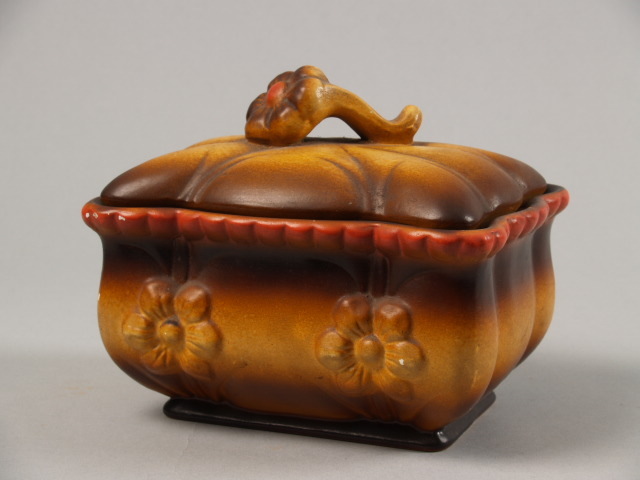 Doos met dekselknoop in vorm van bloem aan steel en floraal reliëf