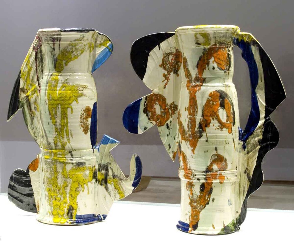 Twee bij elkaar horende gedraaide vaasvormen met expressieve, aangezette flappen aan de zijkanten. De vazen hebben een crèmekleurig onderglazuur met daardoor heen uitbundige tekeningen van lelies in geel en oranje glazuur. De kleurstelling van de achterkant is anders, in groen-gele tinten. De vazen dienen samen te worden opgesteld, waarbij de flappen in elkaar grijpen tot ...