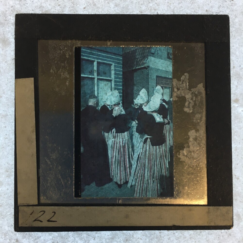 Volendammers op de rug gezien nabij een woning