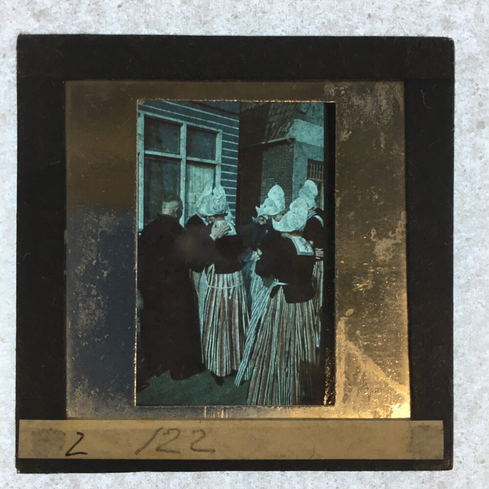Volendammers op de rug gezien nabij een woning