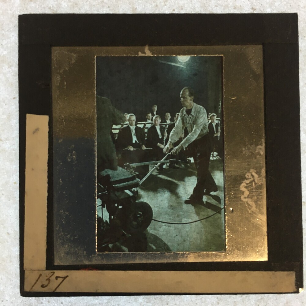 Orkestleden met transporteur van camera dolly