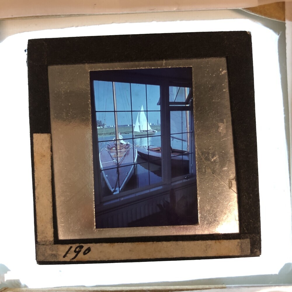 Doorkijk door een raam naar twee zeilboten aan een steiger