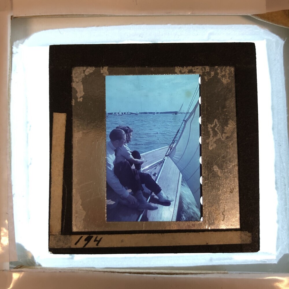 Dame en heer op voorplecht van een zeilboot