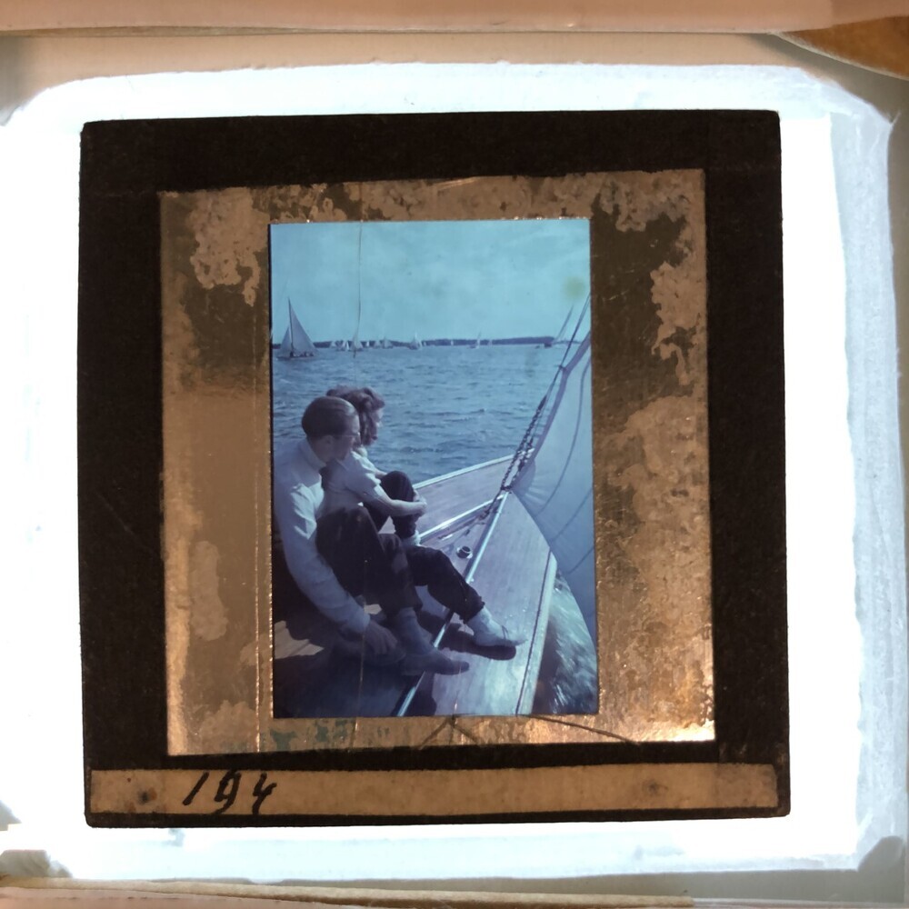 Dame en heer op voorplecht van een zeilboot