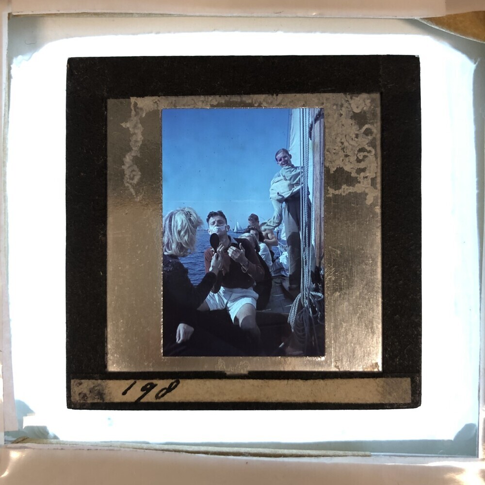 Drie dames en drie heren bij een scheerscène