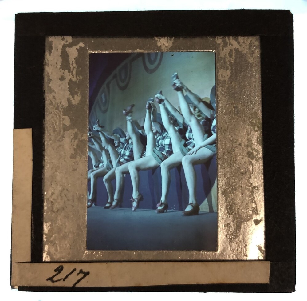 Revuegirls tonen hun benen zittend op een rij