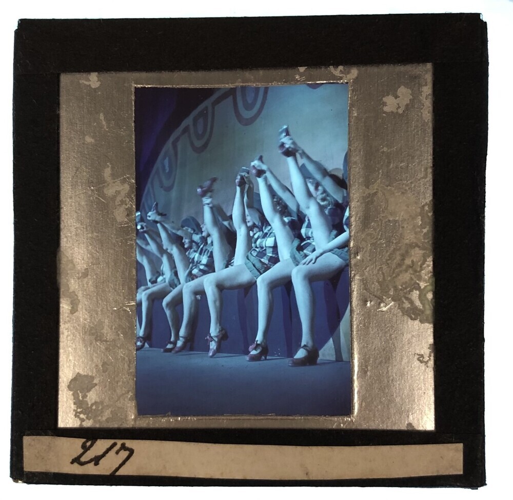 Revuegirls tonen hun benen zittend op een rij