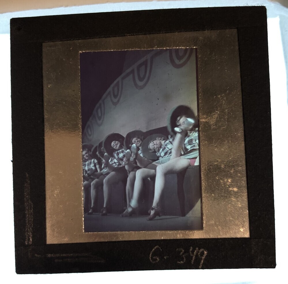 Bouwmeester revue. Groepje zittende dames op toneel