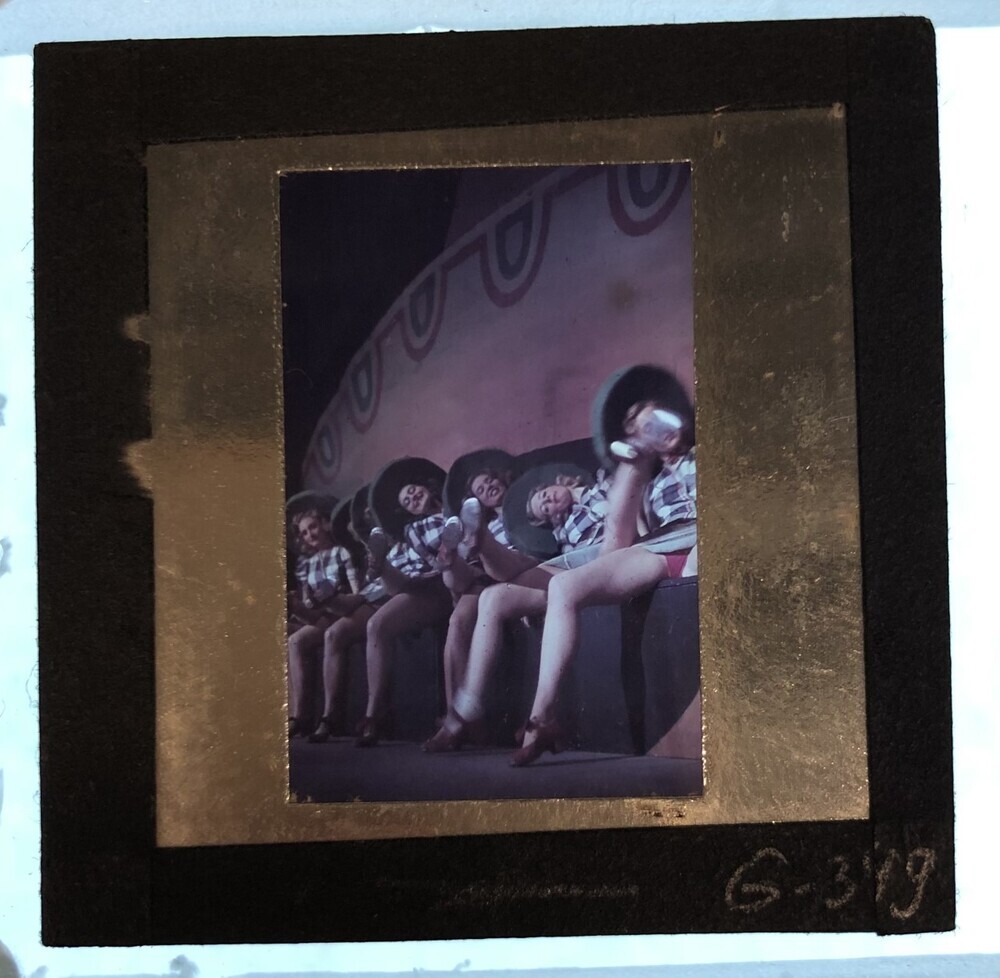 Bouwmeester revue. Groepje zittende dames op toneel