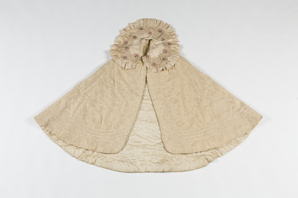 Cremekleurige, zijden gewatteerde mantel met goud bestikt en met bloemen bestikkte kraag