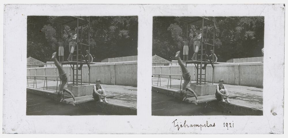 Duikplank van zwembad Tjihampelas in Bandoeng (Indonesië)