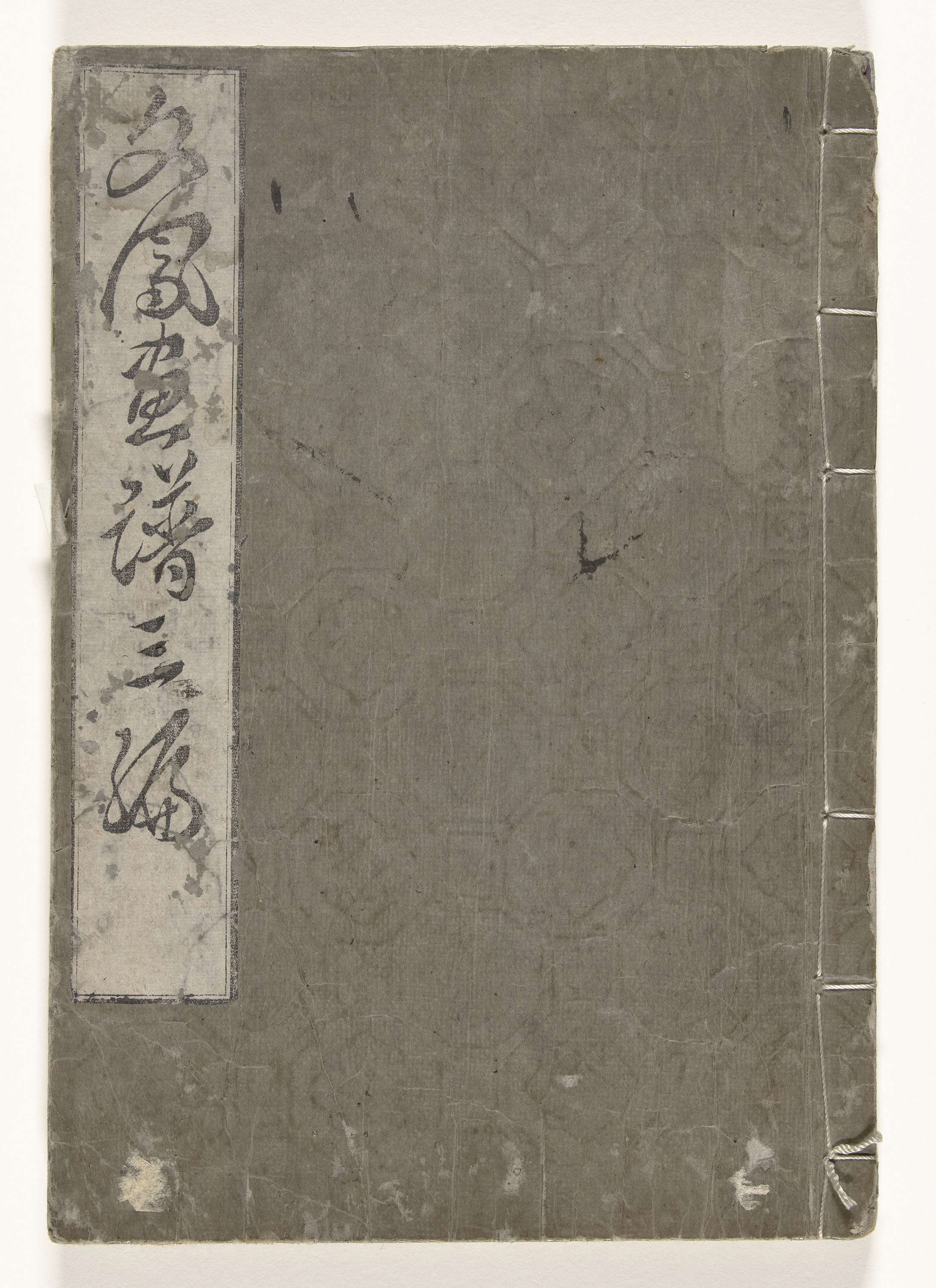 Deel drie (van drie); grijsbruine kaft met octogonaal patroon in blinddruk; titelstrook linksboven; dekblad met handgeschreven Japans opschrift; 36 bladen, genummerd; drie pagina`s voorwoord; 2-35a, afbeeldingen van mensen, dieren en landschappen; 35b en dekblad, colofon.