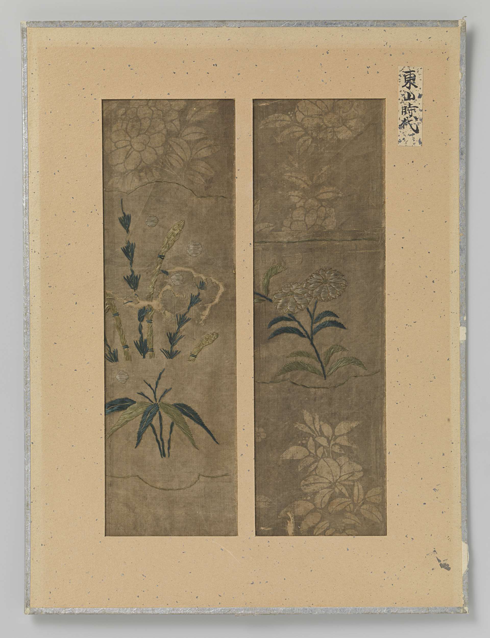 Twee textielfragmenten op een blad, borduursel en druk op zijde