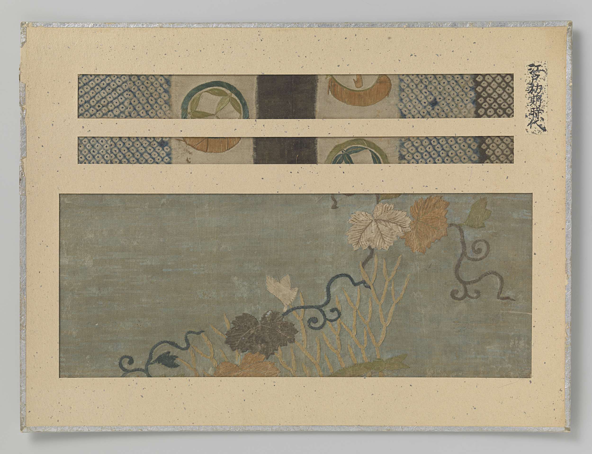 Drie textielfragmenten van twee verschillende kleden op een blad, borduursel en shibori-zome op zijde.
