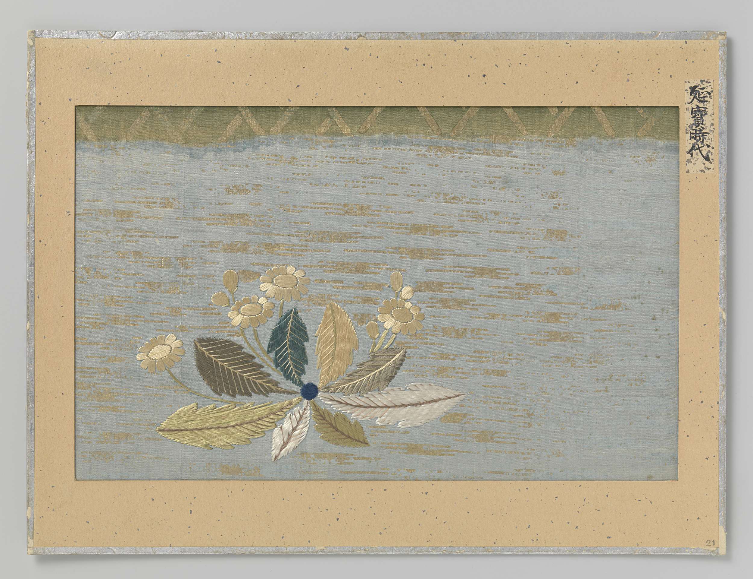 Textielfragment, borduursel van bloemen en bladeren op blauw zijden fond.