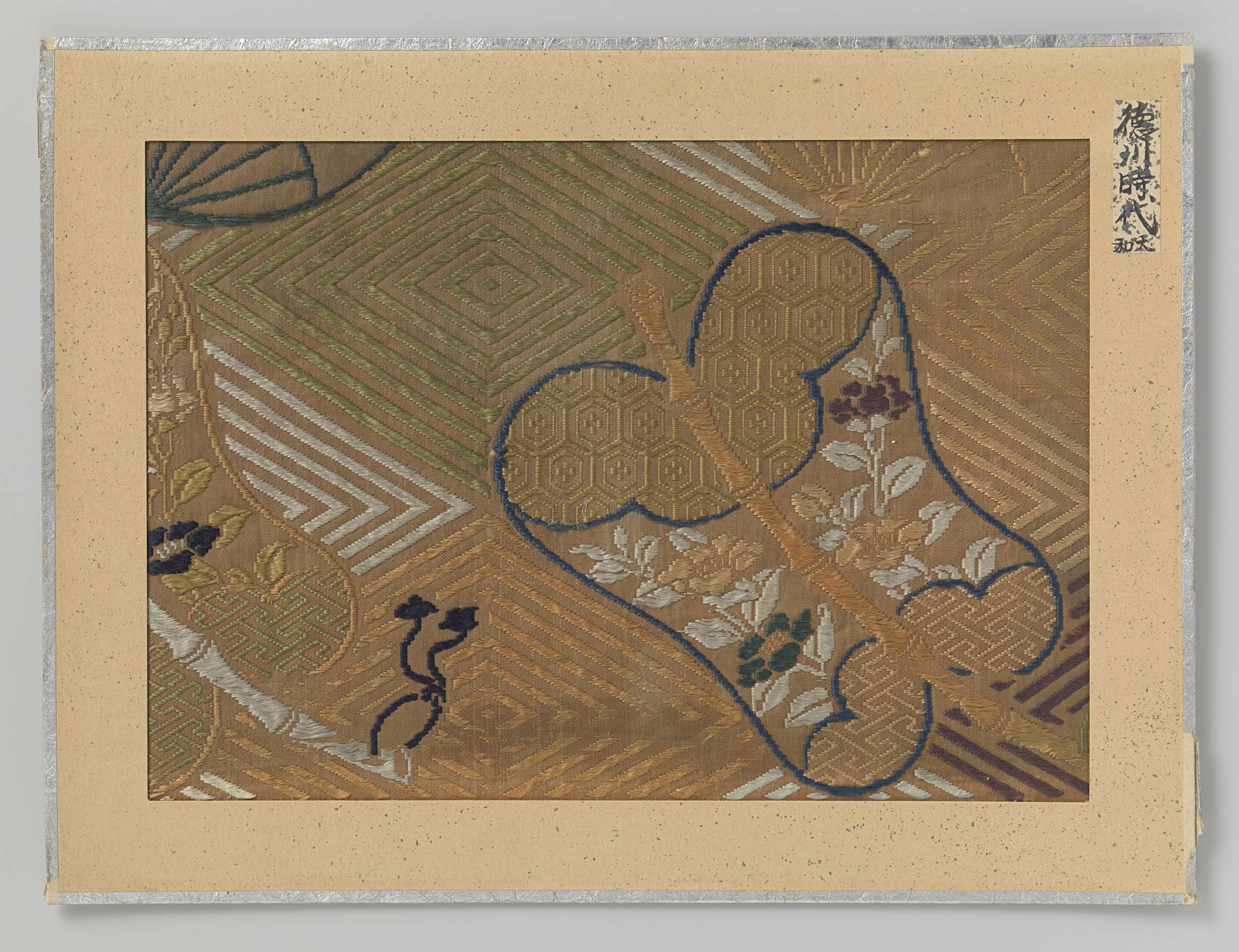 Textielfragment, versiering waaier en geometrische motieven op een bruin fond.