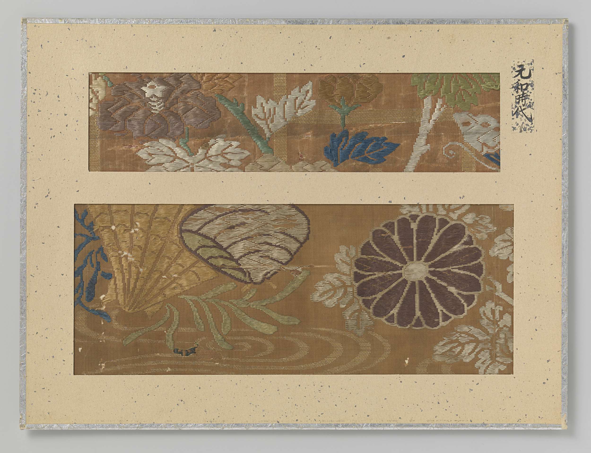 Textielfragmenten, twee, borduursel van bloemen en bladeren en kirikane.