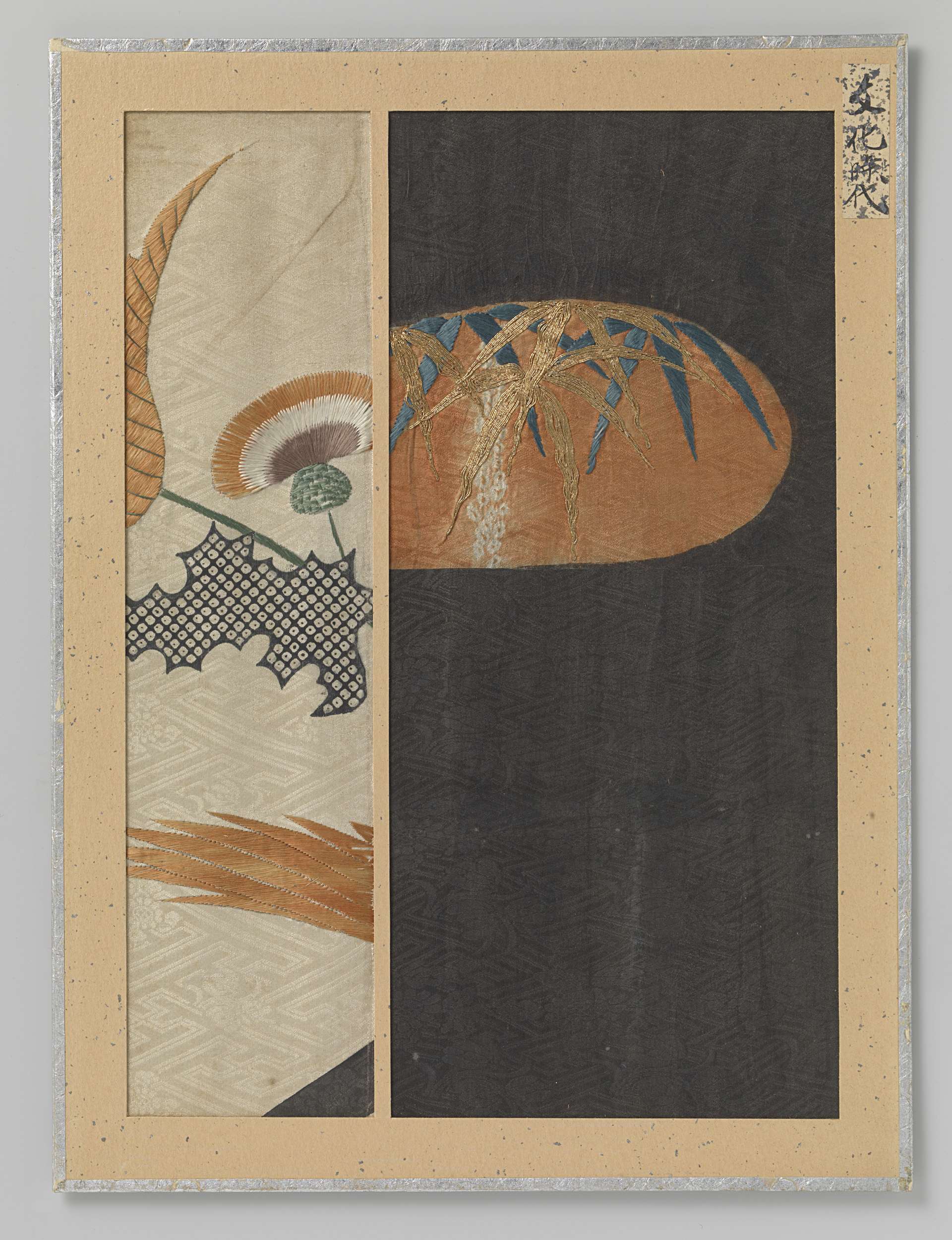 Twee textielfragmenten, borduursel en druk op sepia en beige damast achtergrond.