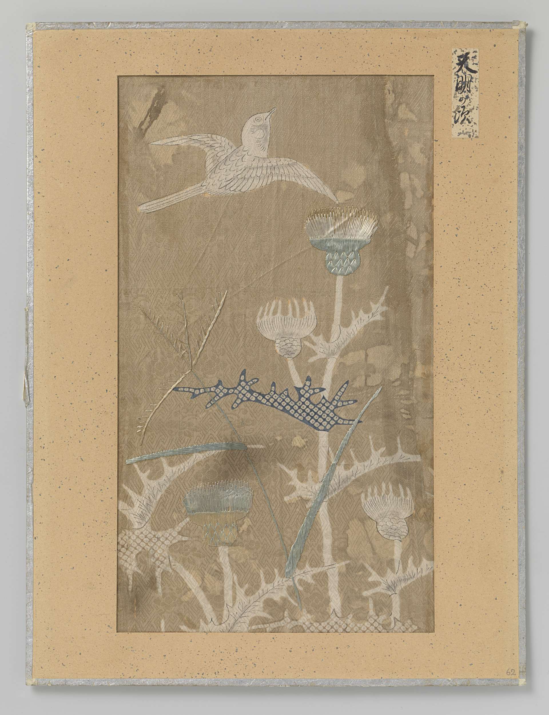 Textielfragment, borduursels en druk van een vogel en distels op een lichtbruine damast achtergrond.