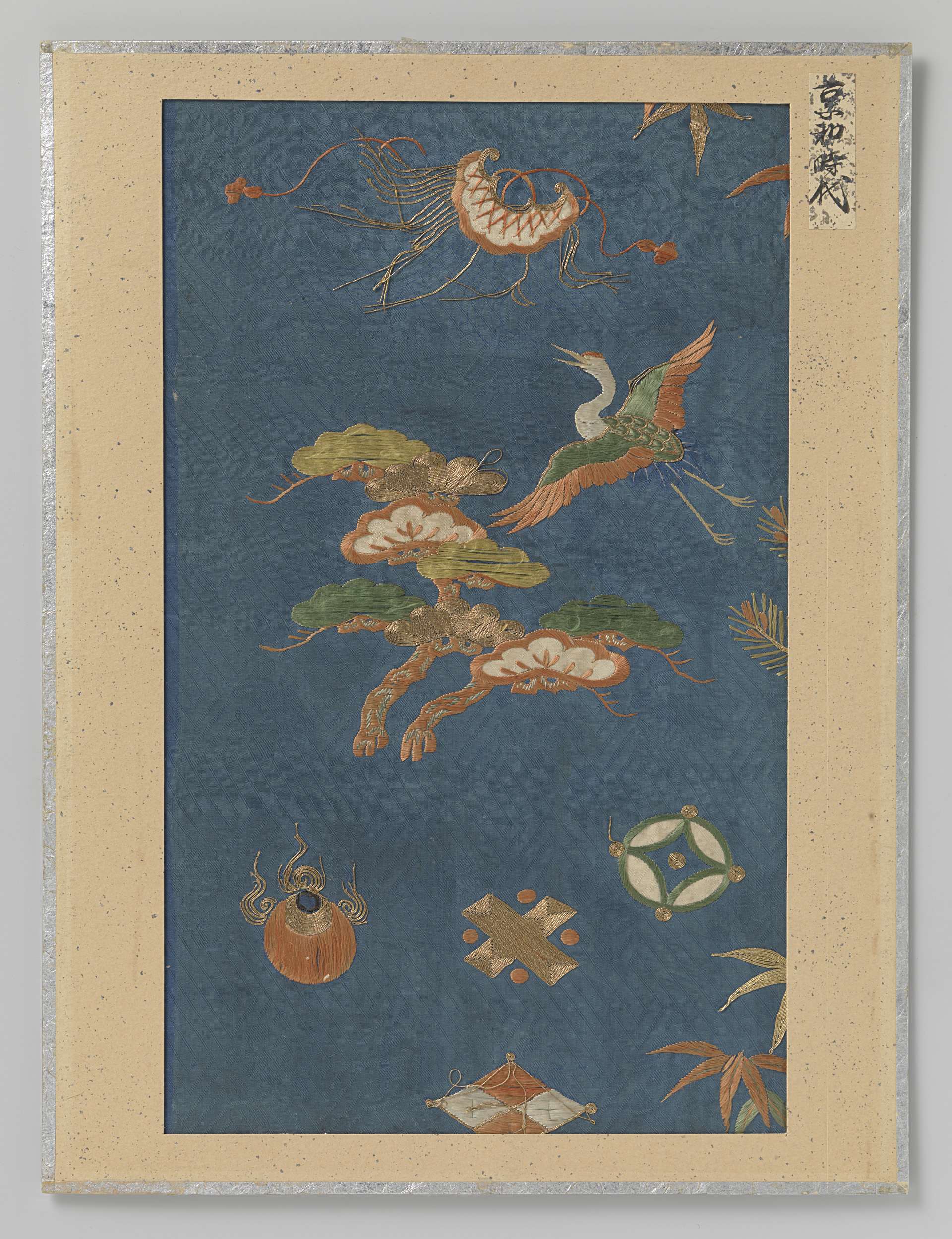 Textiel-fragment, borduursel van gelukssymbolen op blauw damast fond.