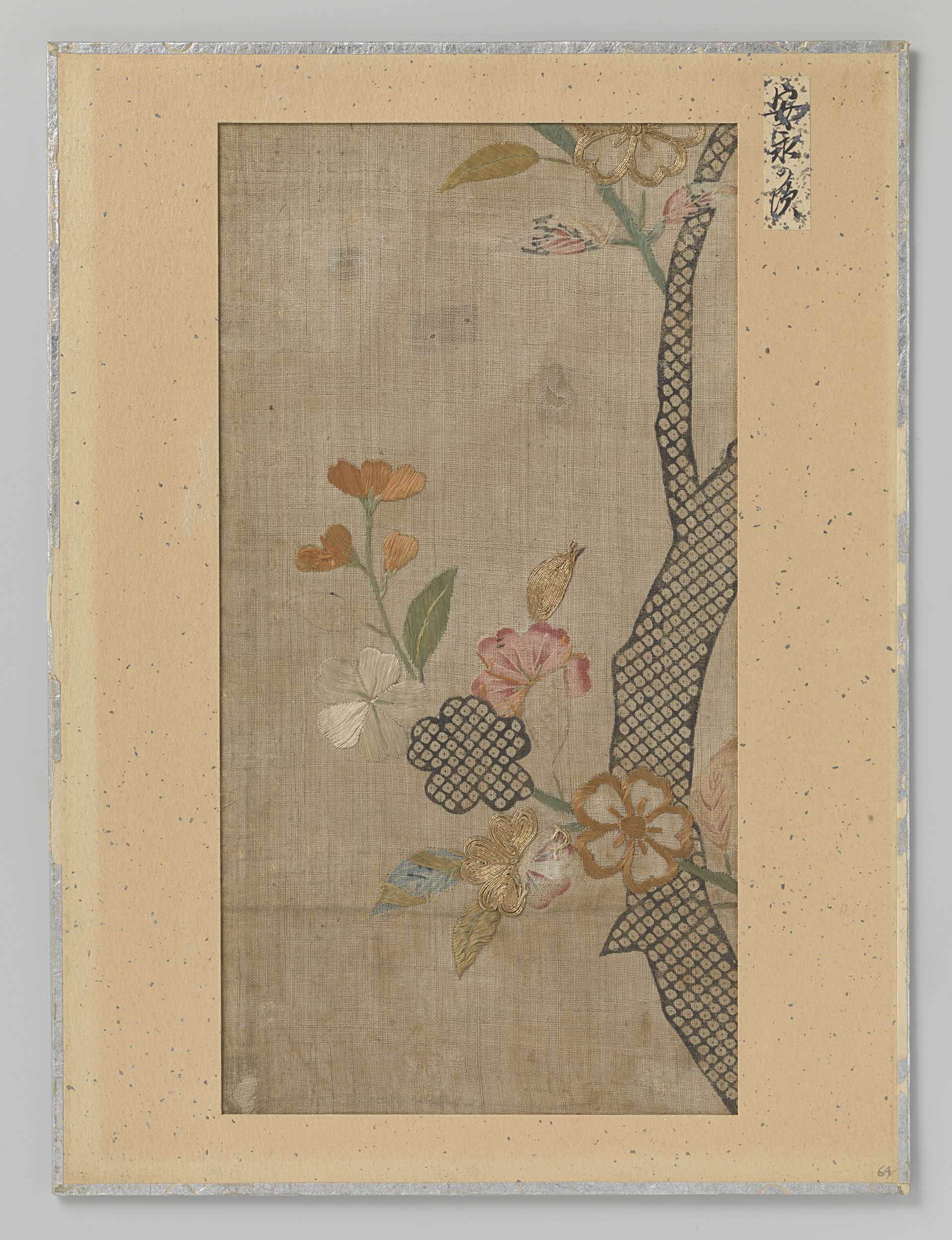 Textielfragment, borduursel en druk van kersebloesem en stam op lichtbruin fond.