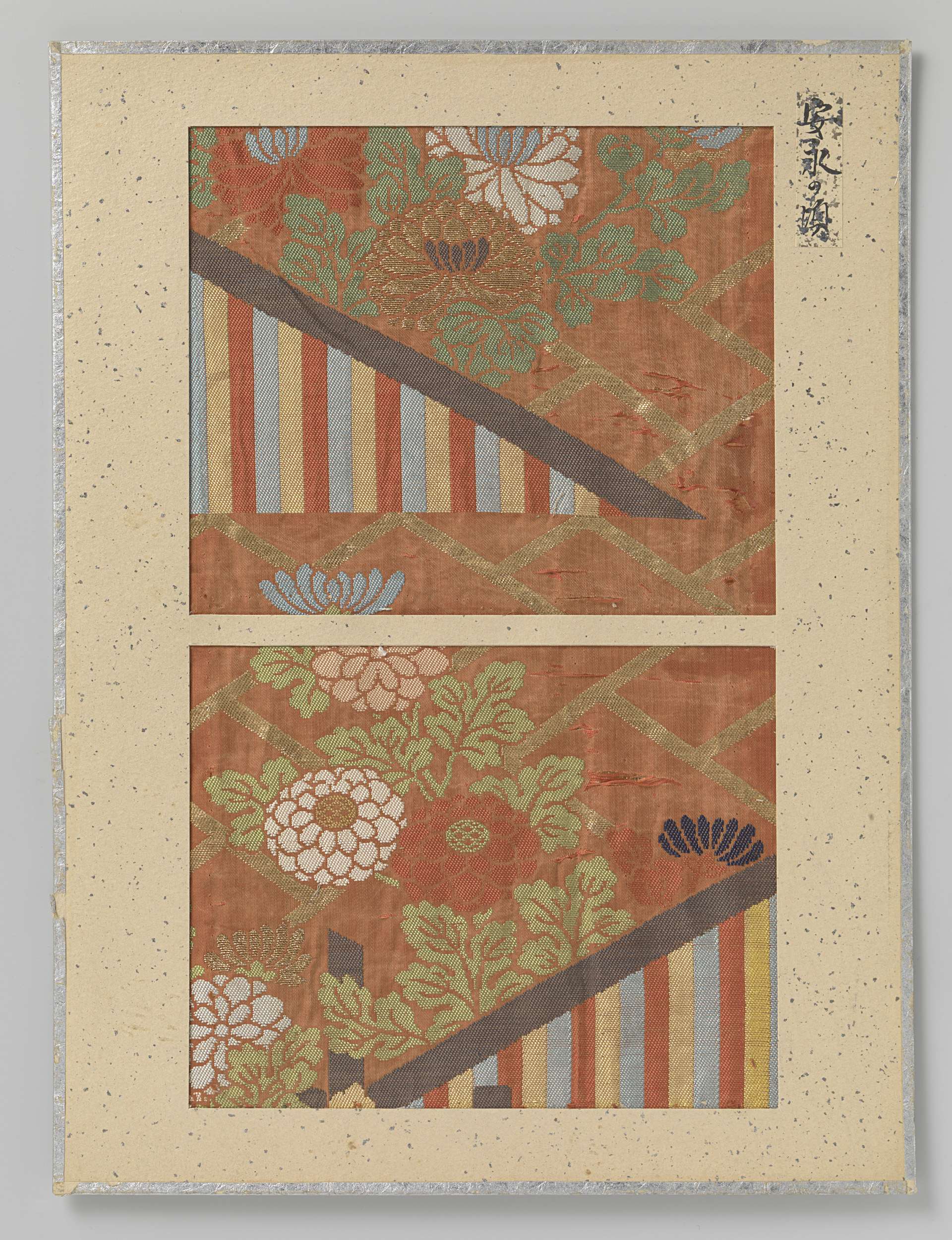 Textielfragmenten, twee op één blad, borduursel op rood fond.