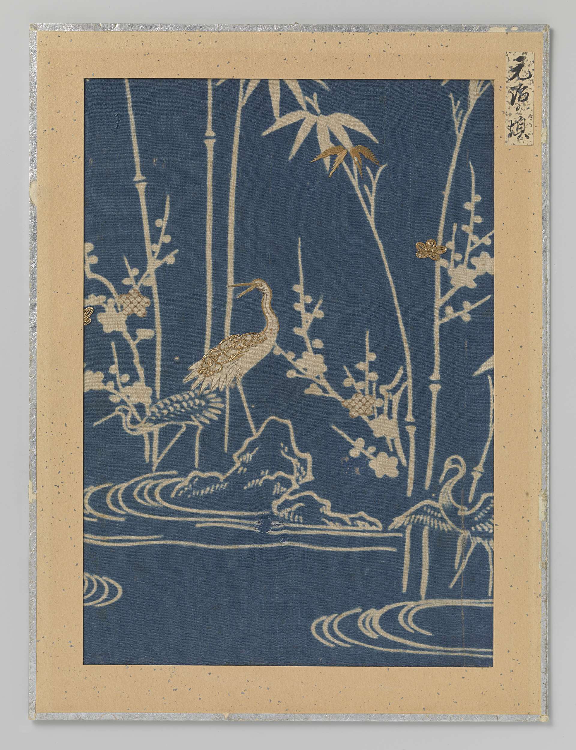 Textielfragment, druk en borduursel van bamboe, pruimebloesems en reigers op blauw fond.